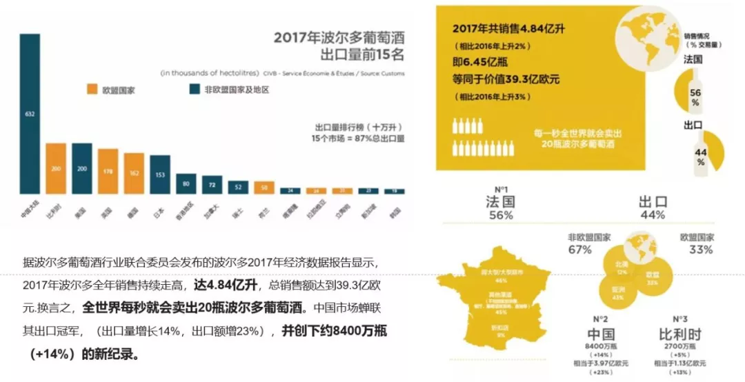 我们一起来看三组数据。首先据波尔多葡萄酒行业联合委员会发布的2017年经济数据报告显示,2017年波尔多全年销售持续走高,总体达4.84亿升,总销售额达39.3亿欧元,换言之全世界每秒就会卖出20瓶波尔多葡萄酒,中国市场连续两年蝉联其出口冠军。同时法国也是中国最大的葡萄酒进口国,基于中国这样的强大的葡萄酒销售市场,精明的中国人不再满足于从波尔多进口葡萄酒,而是开始选择直接买下波尔多的酒庄,从源头控制生产。因此中国买家在法国投资酒庄的数量呈爆发式增长,过往十年在波尔多收购酒庄的华人达178位,而且这个数字还在以飞快的速度不断地上升。